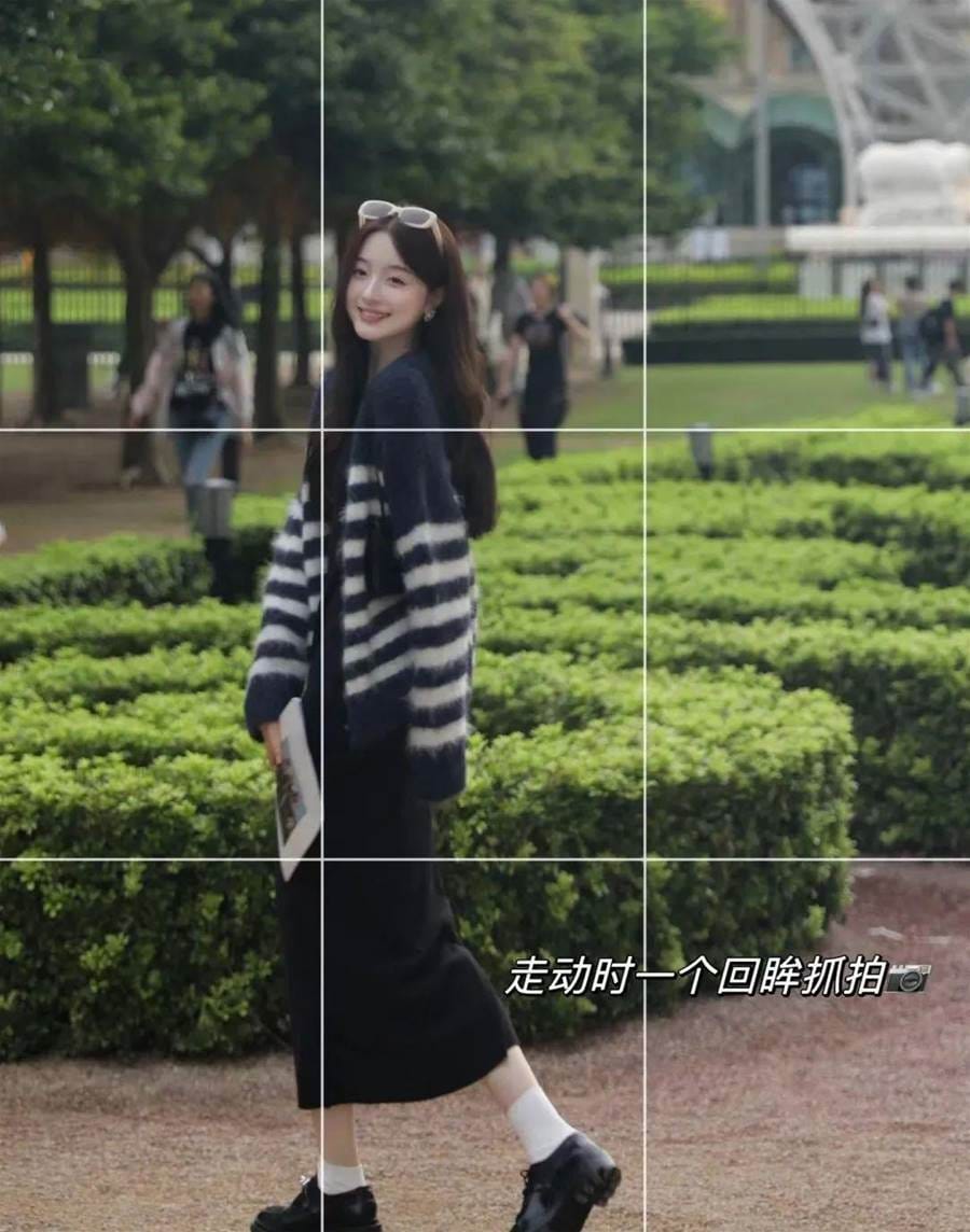 5、拍全身照的時候,可以稍微將身體向下彎一下,更加有靈性,自然的看向鏡頭微笑就可以了。