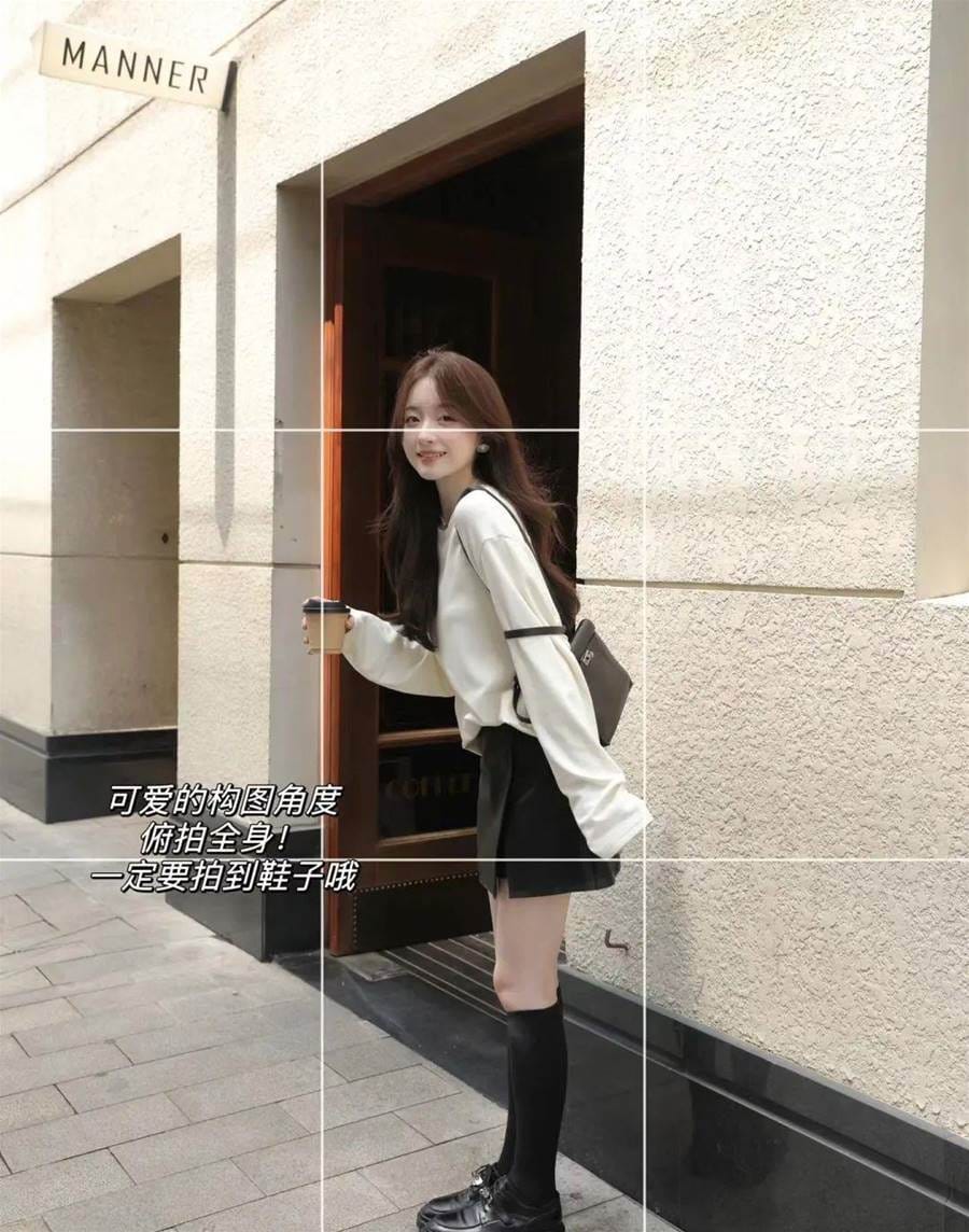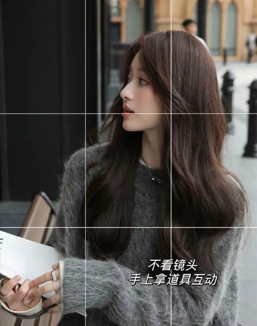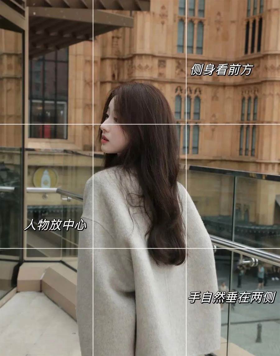 1、拍照時將人物放在右上角,從側面拍半身照,模特可以扭頭看向鏡頭,面露微笑。