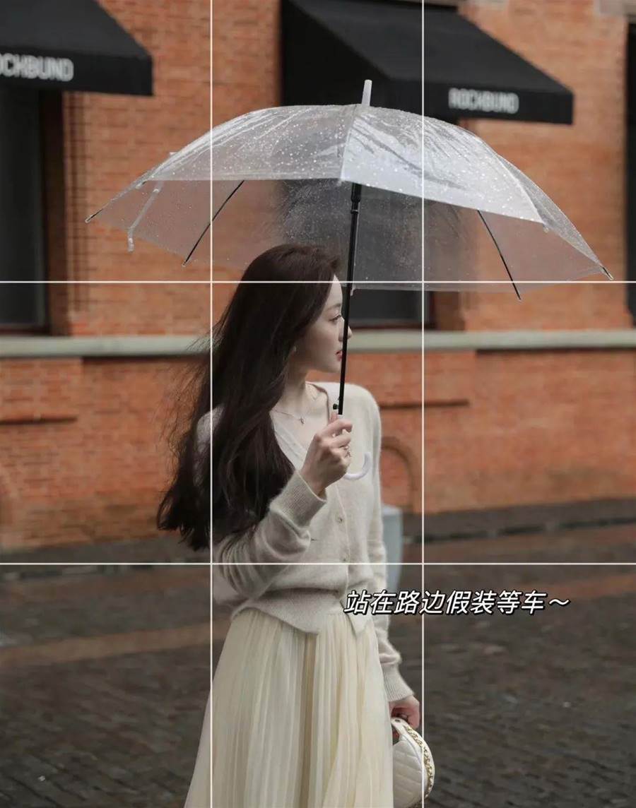 6、白色的透明雨傘也是一個非常棒的拍照道具,可以撐傘假裝在路邊等車,自然好看。