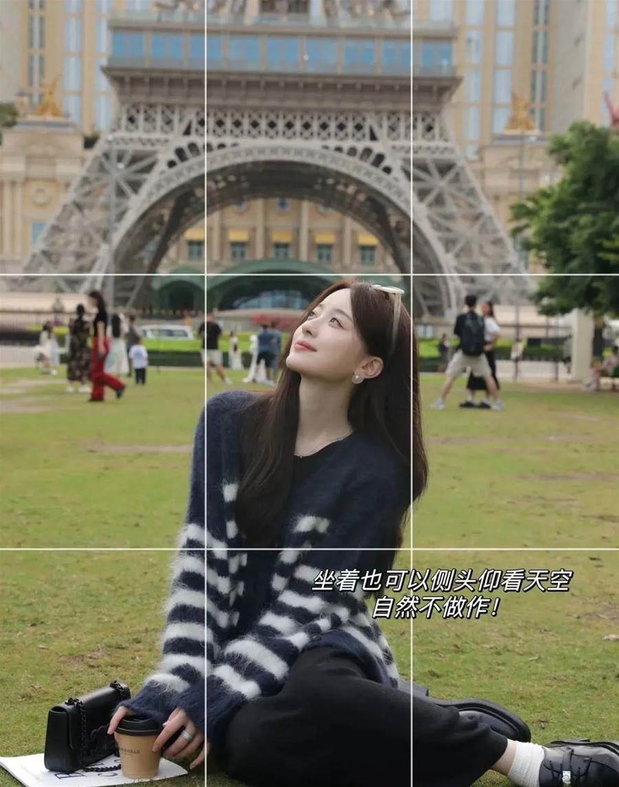 9、逛公園,遇到草坪,可以席地而坐,肩膀一高一低,繃緊腰桿,抬頭看向天空。