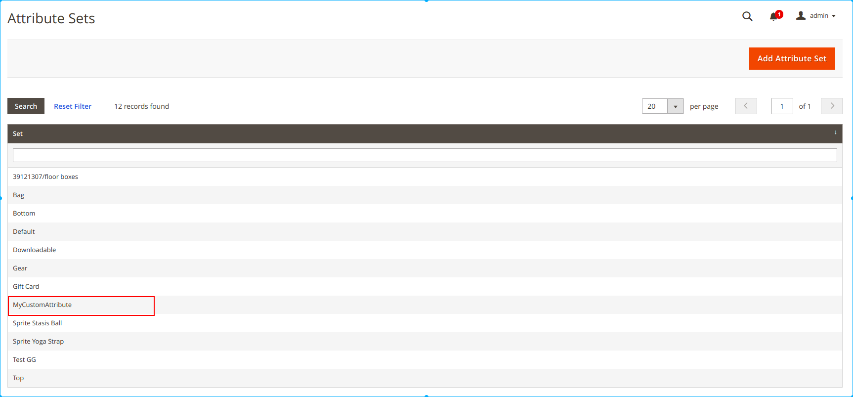 转到管理后台: Store > Attributes > Attribute Set ,可以看见创建的产品属性集 MyCustomAttribute :